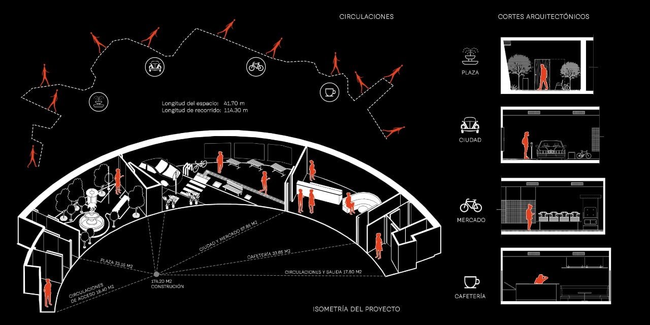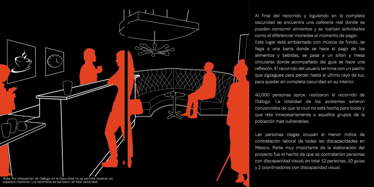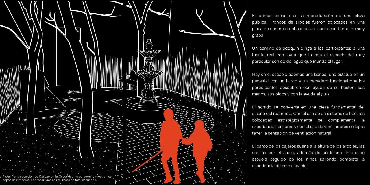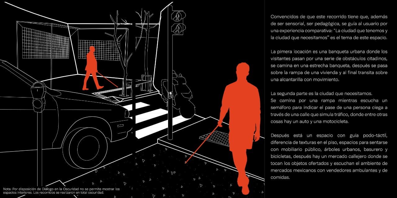 El recorrido se divide en tres atmósferas distintas. Primero, nos lleva por el espacio acondicionado como un parque que da la bienvenida a los usuarios. Posteriormente, se pasa a la atmósfera citadina, donde la primera sección presenta los retos que tienen la mayoría de las ciudades mexicanas; rampas en las banquetas, postes atravesados o tapas de alcantarilla con movimiento; del otro lado, una ciudad que tiene guías podotáctiles, correcta señalización y un diseño urbano inclusivo para mostrar el contraste en la experiencia entre estas dos formas de urbanizar. Finalmente, se pasa a una cafetería atendida por personal compuesto de personas ciegas que incentivan una reflexión entre los participantes.