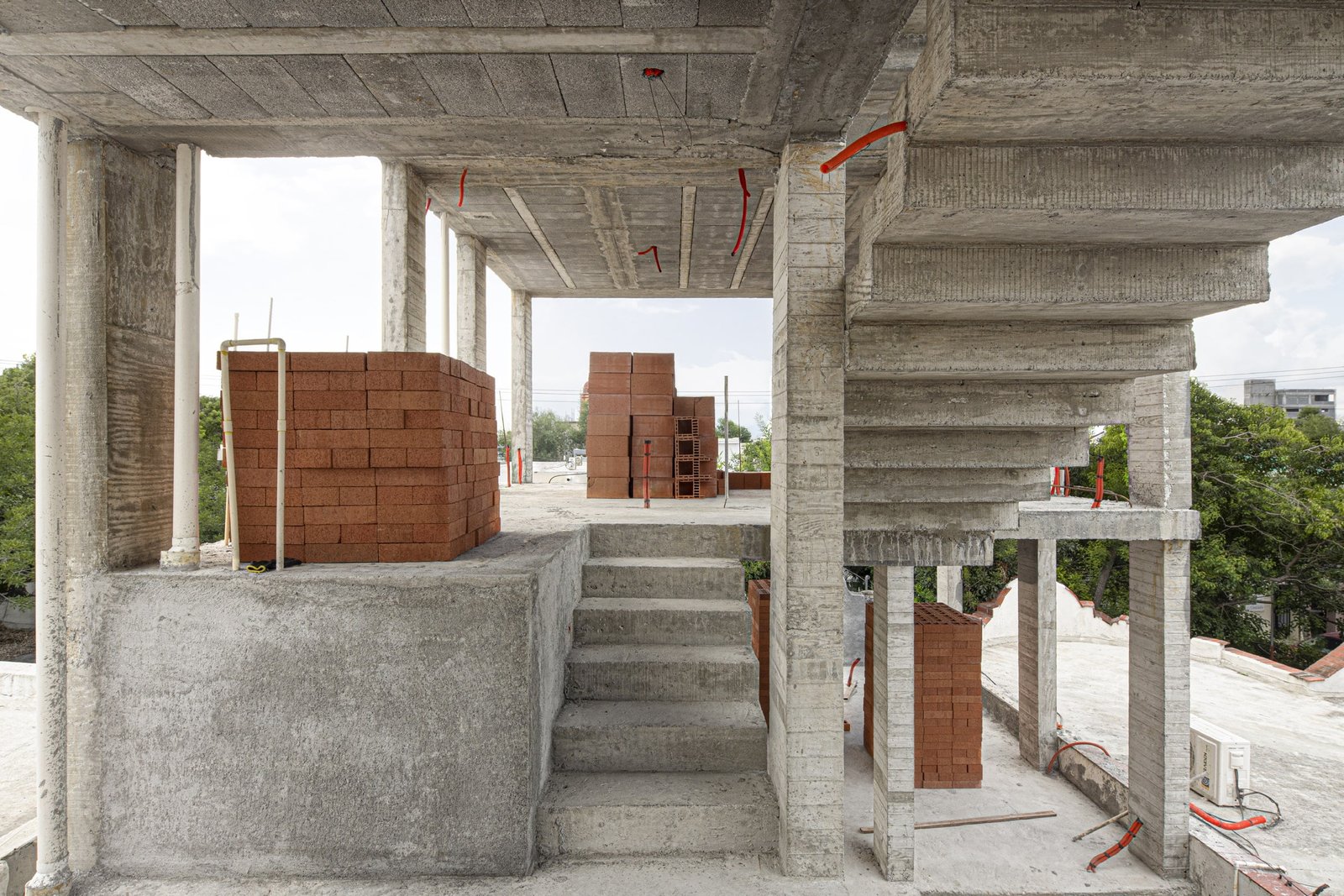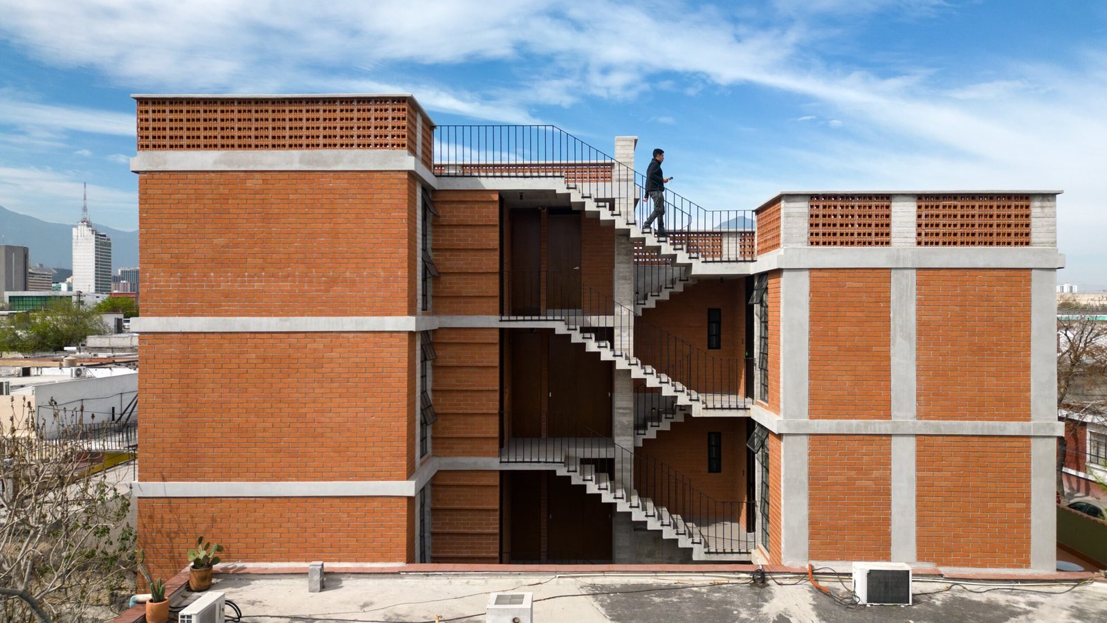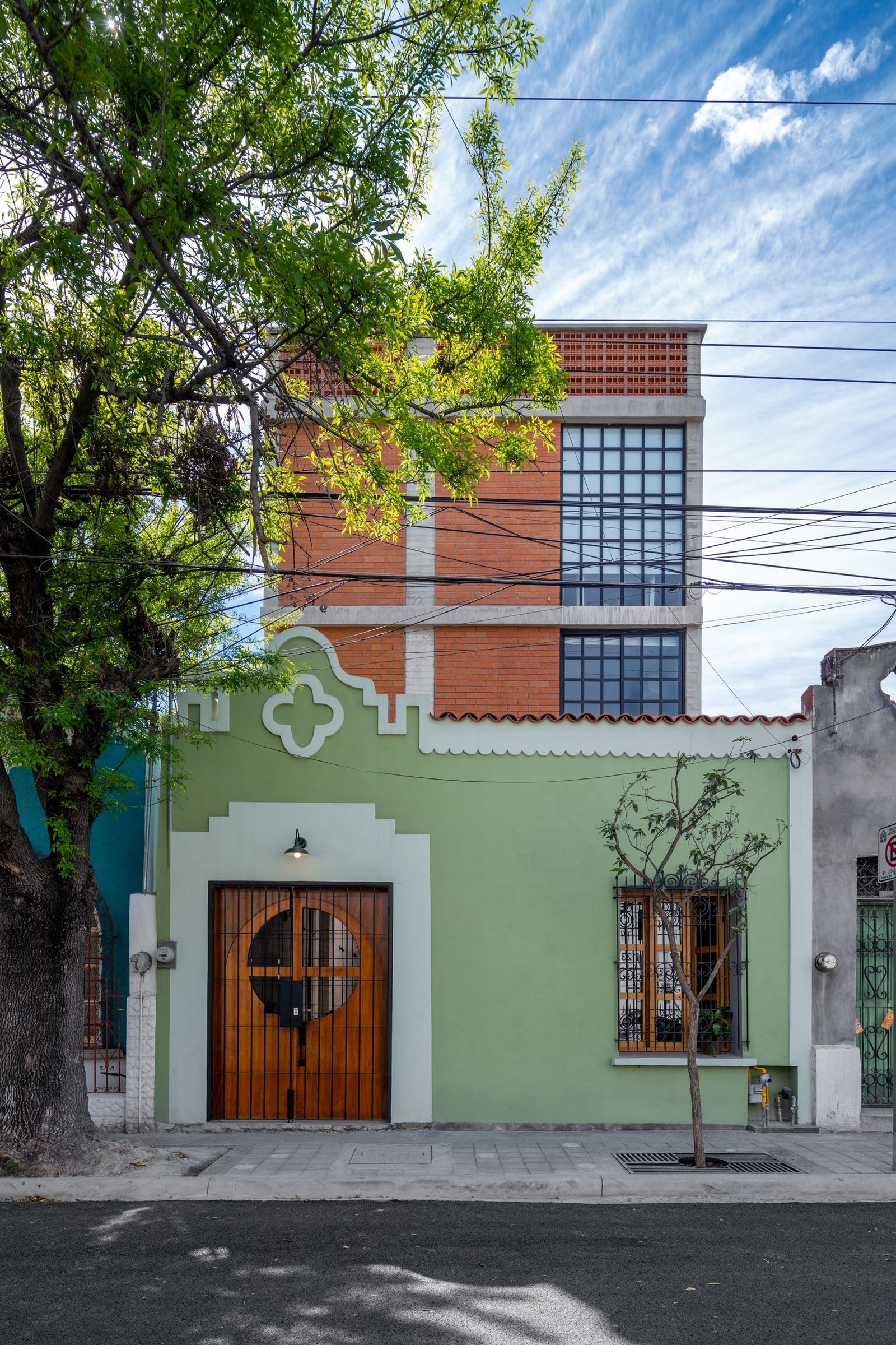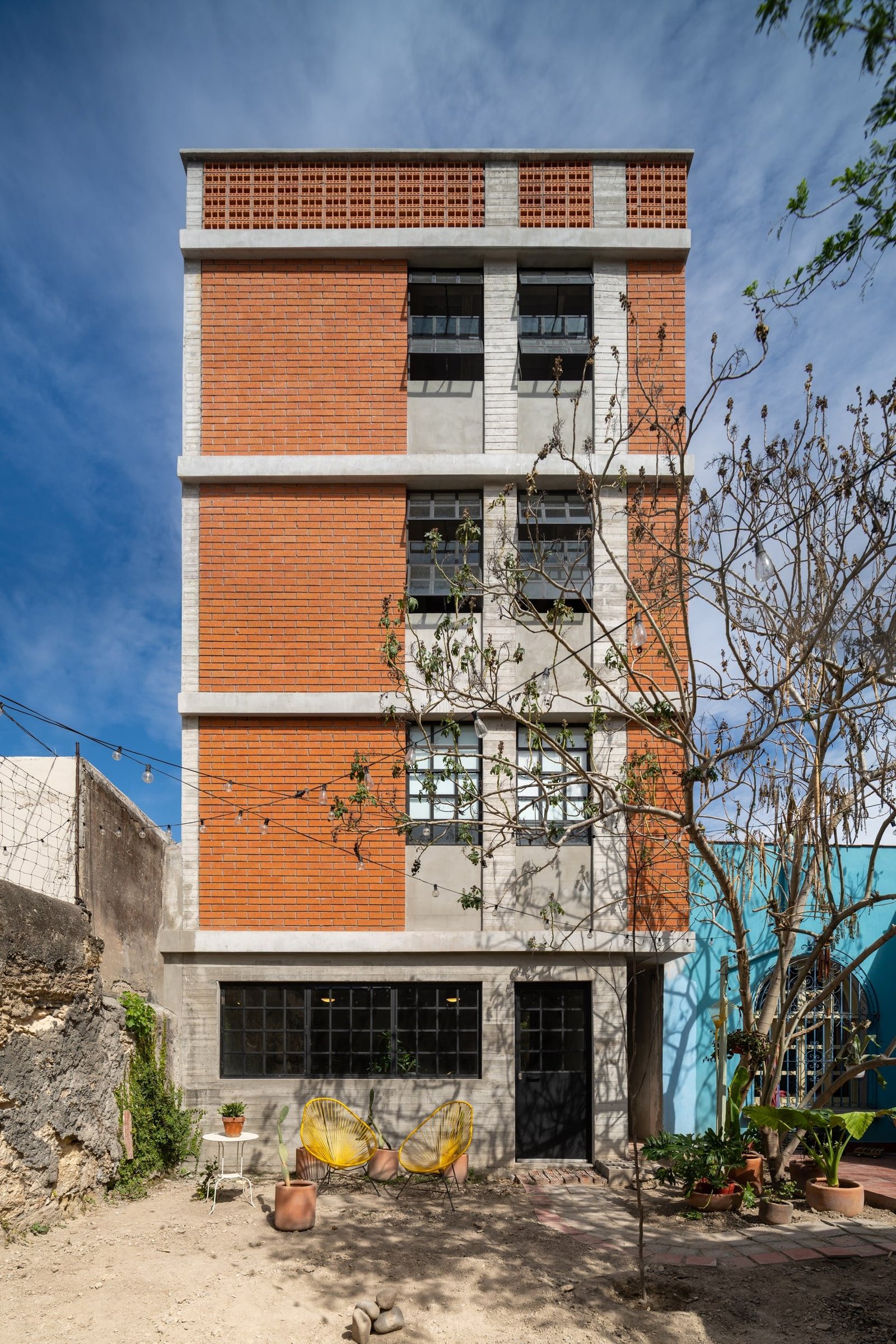El retranqueo del edificio reafirma el respeto a la escala y contexto histórico de las construcciones de la primera mitad del siglo XX que le rodean. Se decidió exponer la nobleza de materiales como el ladrillo, que juega un papel protagónico y multifacético en esta obra. En algunos puntos, el ladrillo sirve como superficie, en otros, configura espacios internos creando contraste de los elementos estructurales. En la terraza, se le coloca lateralmente para crear una celosía que permite continuar las vistas a la ciudad. El ladrillo es la unidad base y el único material utilizado para los muros.