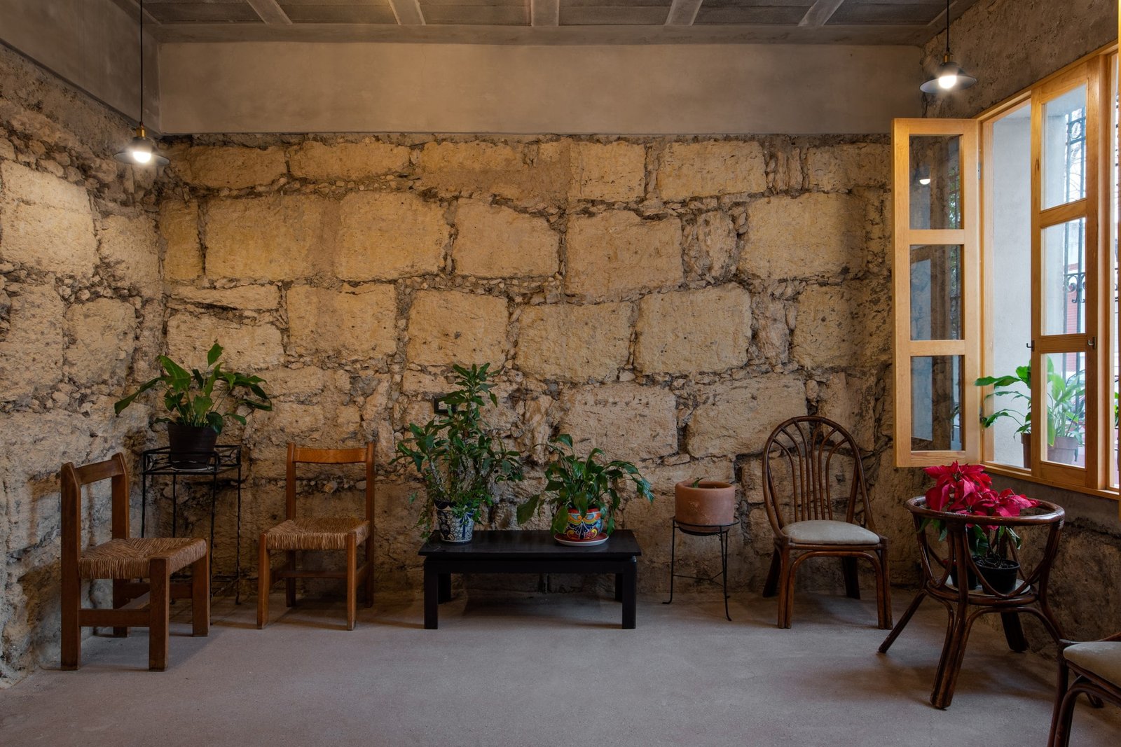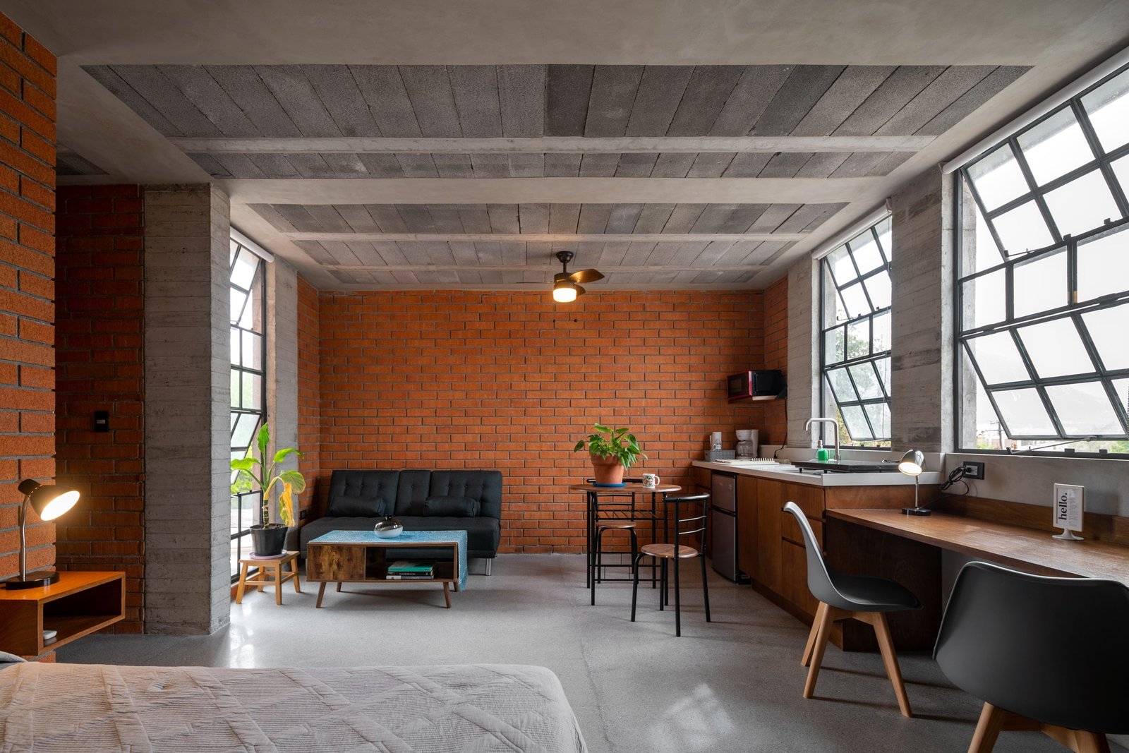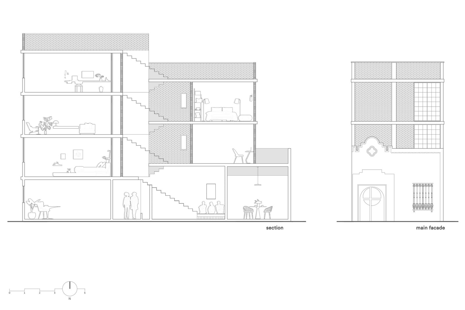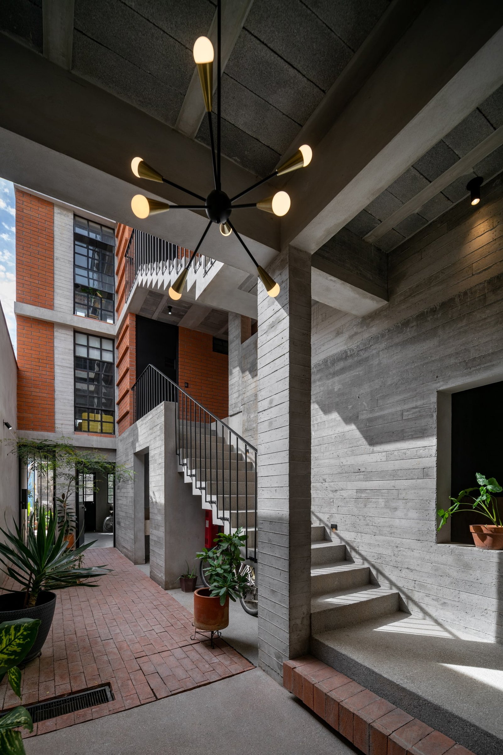 El retranqueo del edificio reafirma el respeto a la escala y contexto histórico de las construcciones de la primera mitad del siglo XX que le rodean. Se decidió exponer la nobleza de materiales como el ladrillo, que juega un papel protagónico y multifacético en esta obra. En algunos puntos, el ladrillo sirve como superficie, en otros, configura espacios internos creando contraste de los elementos estructurales. En la terraza, se le coloca lateralmente para crear una celosía que permite continuar las vistas a la ciudad. El ladrillo es la unidad base y el único material utilizado para los muros.
