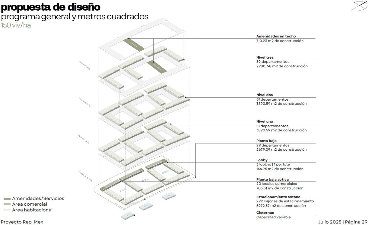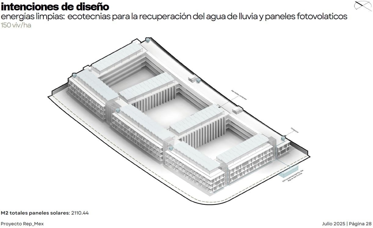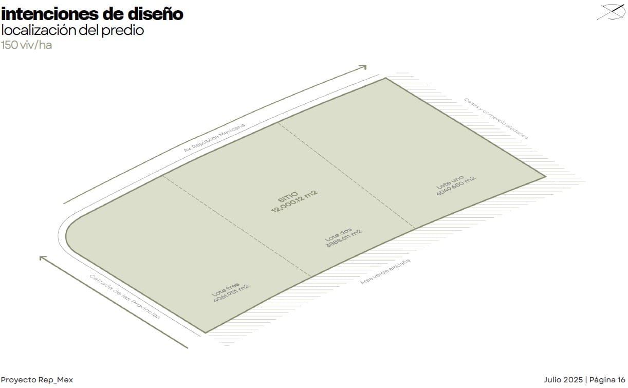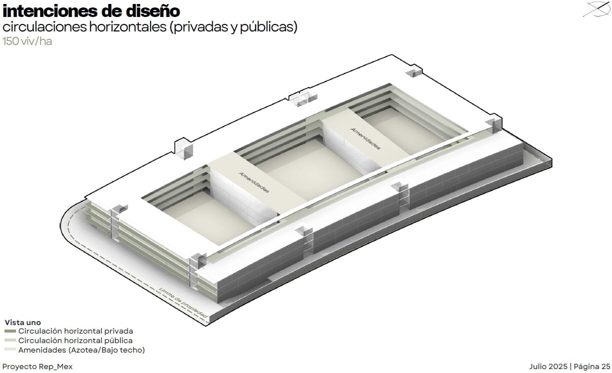Rep_Mex es un proyecto de Usos Múltiples en el municipio de Escobedo. El diseño busca integrarse a las dinámicas preexistentes de una zona en proceso de consolidación, donde predomina la vivienda unifamiliar pero existe una clara carencia de servicios de proximidad. El conjunto se organiza de manera perimetral para contener patios interiores de uso común, generando bordes activos y transiciones suaves hacia el barrio. La incorporación de vegetación, áreas de sombra y espacios abiertos responde al clima de la región y refuerza la vida comunitaria. La planta baja aportan comercios y servicios de cercanía, contribuyendo a diversificar los usos y brindar seguridad natural a través de la presencia constante de usuarios. En las azoteas se destinan áreas de convivencia y amenidades colectivas, coronando el conjunto con vistas abiertas hacia la ciudad y el paisaje circundante. Finalmente, el proyecto integra estrategias sostenibles como la recuperación de agua de lluvia y la colocación de paneles solares, reforzando su compromiso con un modelo urbano más resiliente y eficiente.