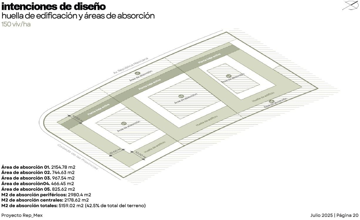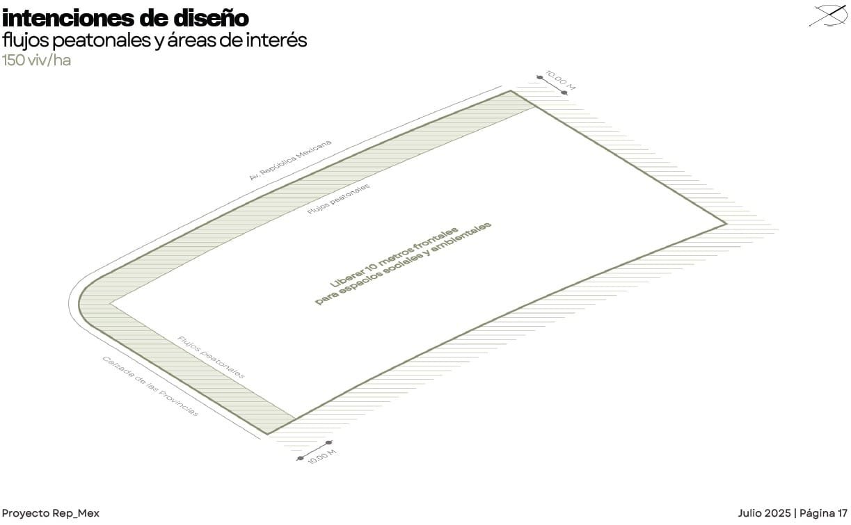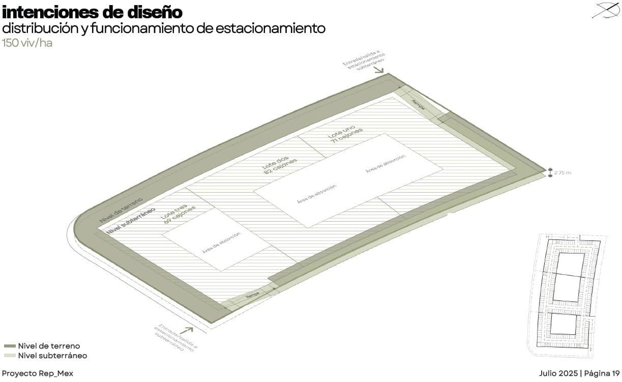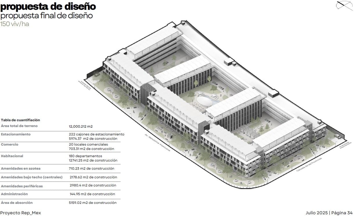 Rep_Mex es un proyecto de Usos Múltiples en el municipio de Escobedo. El diseño busca integrarse a las dinámicas preexistentes de una zona en proceso de consolidación, donde predomina la vivienda unifamiliar pero existe una clara carencia de servicios de proximidad. El conjunto se organiza de manera perimetral para contener patios interiores de uso común, generando bordes activos y transiciones suaves hacia el barrio. La incorporación de vegetación, áreas de sombra y espacios abiertos responde al clima de la región y refuerza la vida comunitaria. La planta baja aportan comercios y servicios de cercanía, contribuyendo a diversificar los usos y brindar seguridad natural a través de la presencia constante de usuarios. En las azoteas se destinan áreas de convivencia y amenidades colectivas, coronando el conjunto con vistas abiertas hacia la ciudad y el paisaje circundante. Finalmente, el proyecto integra estrategias sostenibles como la recuperación de agua de lluvia y la colocación de paneles solares, reforzando su compromiso con un modelo urbano más resiliente y eficiente.