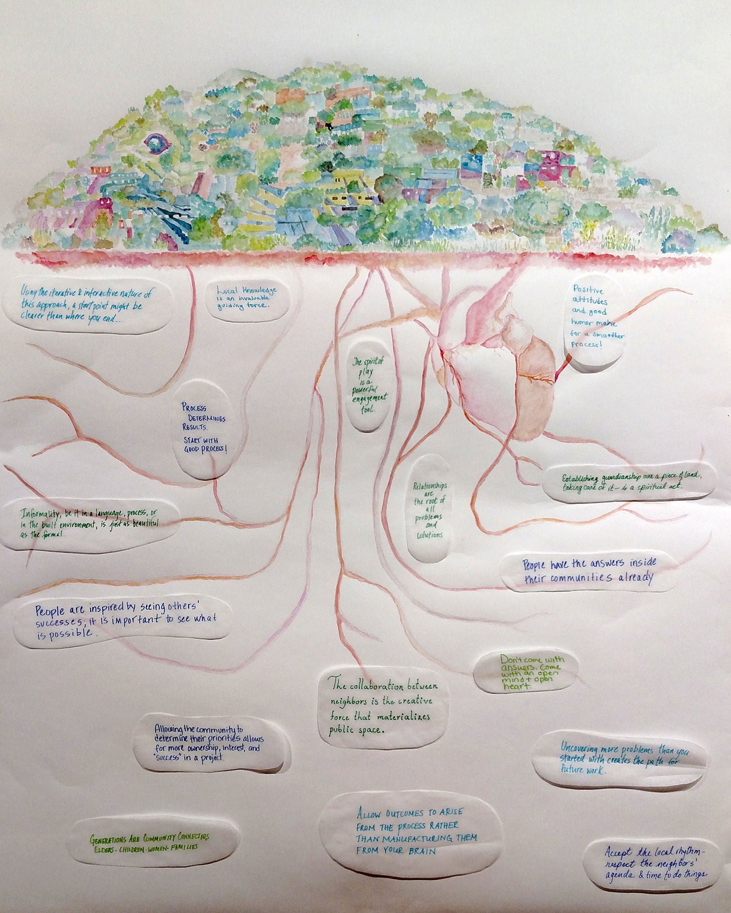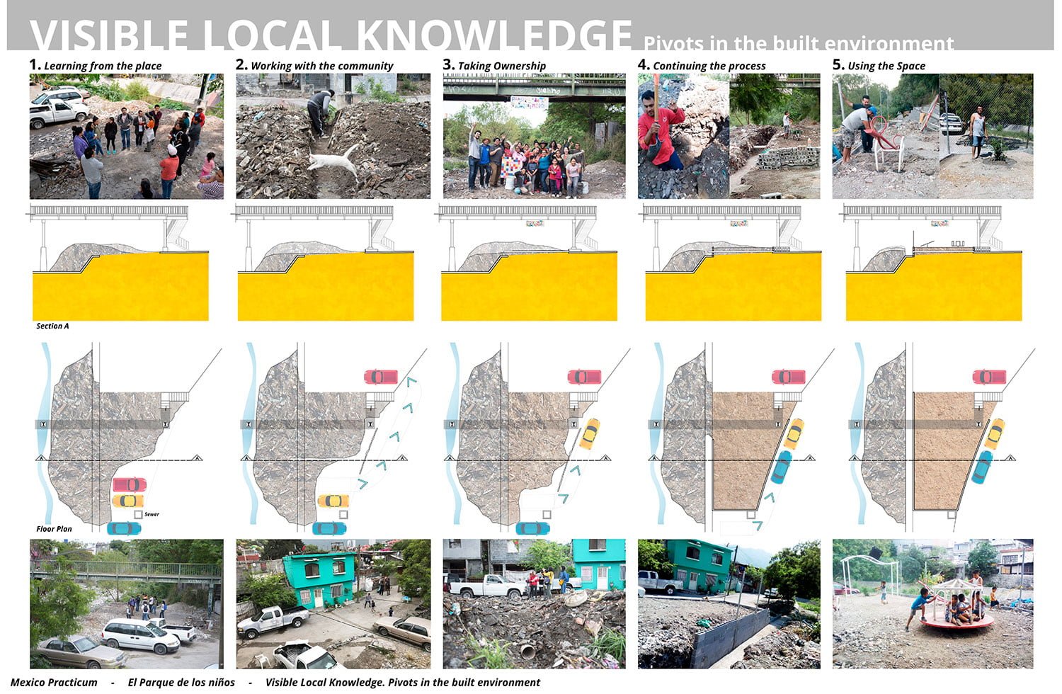 Trabajo participativo con la comunidad de La Campana en Monterrey, México. Este fue un proyecto financiado gracias a una beca de CONTEX-CONAHCYT en 2019, que permitió a un grupo de la Universidad de Texas en Austin pudieran realizar trabajo de campo en México. El equipo de la UT trabajó colaborativamente con una asociación civil con presencia en La Campana llamada Barrio Esperanza. En conjunto con la comunidad, se trabajó un proceso co-creativo partiendo de los recursos locales para transformar un espacio donde se había tirado basura por años, en un parque para las infancias de la zona. Este proceso fue iniciado por la colaboración de la UT y Barrio Esperanza, pero trabajado y apropiado por los vecinos, quienes lo terminaron poniendo su trabajo y recursos para hacer de este parque una realidad.
